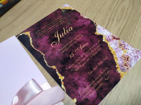 Tamanho 20x15cm, envelope em papel Marsala Fosco 180g, convite em PTG transparente com impressão Silk Screen Dourada e acabamento com cordão + lacre + sempre viva. Pedido mínimo: 30 unidades. Prazo de produção: até 15 dias úteis a partir da aprovação da arte.