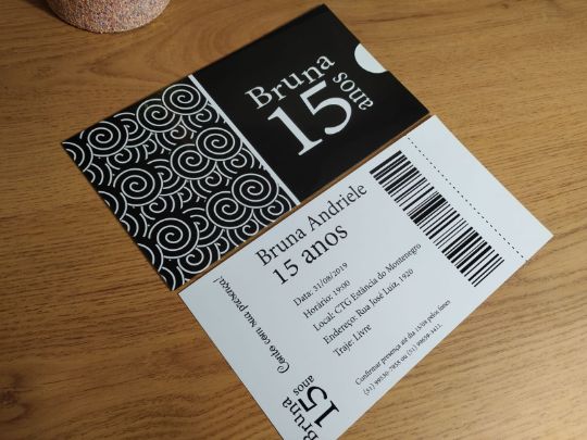 Convite 20x14cm, envelope em papel Color Plus Preto Fosco 180g com aplicação de Glitter, convite em papel Couche 300g impressão frente e verso e acabamento com fita de cetim. Pedido mínimo: 30 unidades. Prazo de produção: até 10 dias úteis a partir da aprovação da arte.