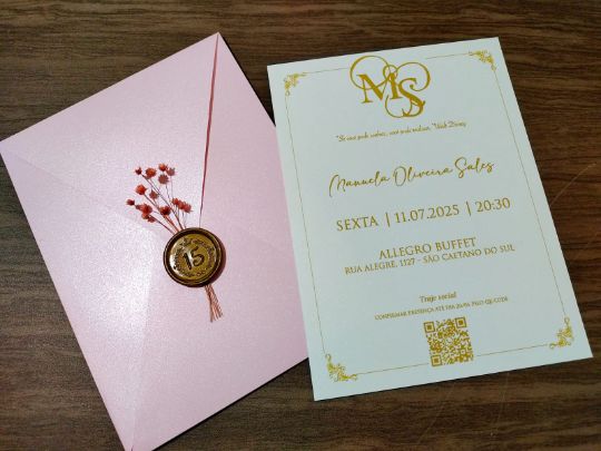 Tamanho 20x16cm, envelope e convite em papel Aspen Perolado 180g, envelope com impressão interna e fechamento com lacre modelo XV. Pedido mínimo:50 unidades. Prazo de produção: até 12 dias úteis a partir da aprovação da arte.
