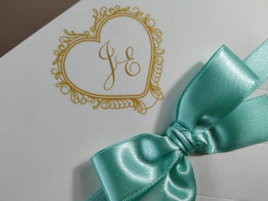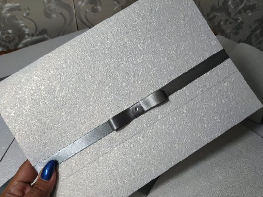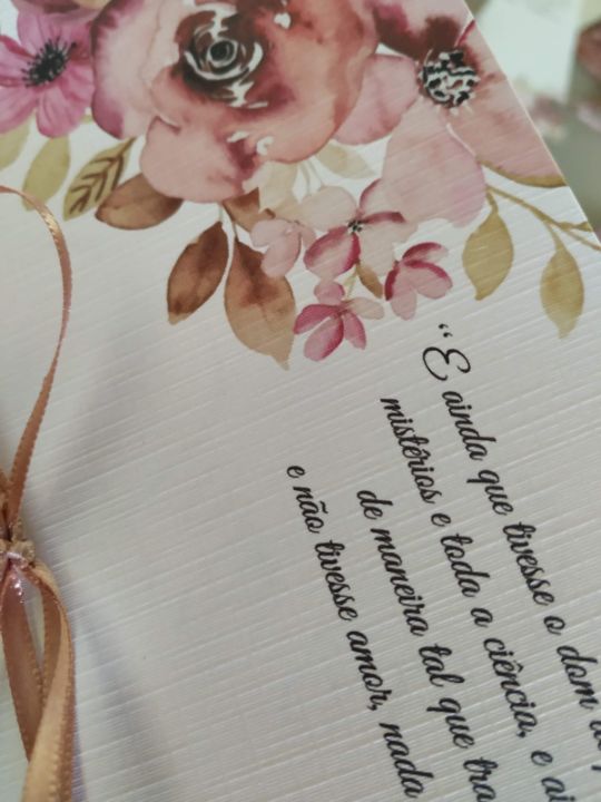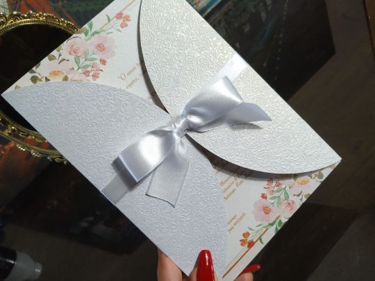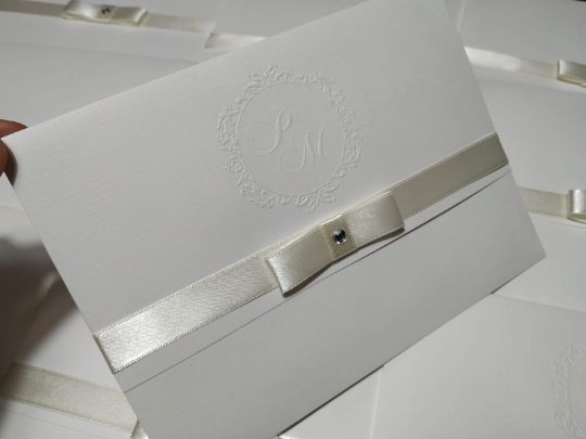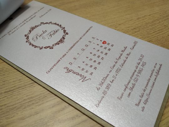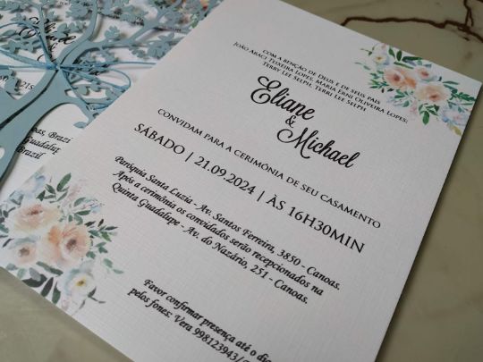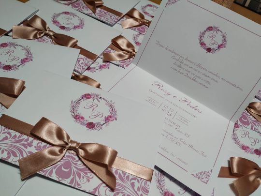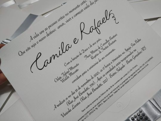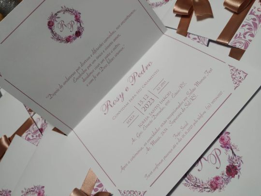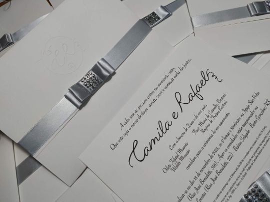 Convite 20x30cm (aberto) e 15x20cm (fechado), produzido em papel Aspen Perolado 250g com relevo na capa e acabamento de fita de cetim. Pedido mínimo: 30 unidades. Prazo de produção: até 12 dias úteis a partir da aprovação da arte.