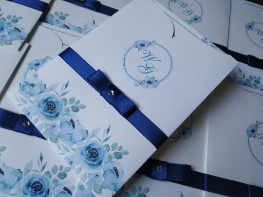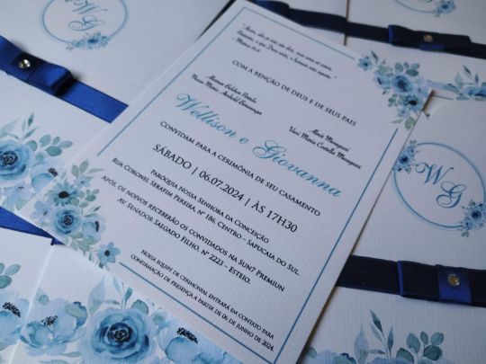 Convite 21x15cm, envelope em Color Plus Azul Serenity Fosco 180g, convite em papel Linho 240g e acabamento com fita de cetim. Pedido mínimo: 30 unidades. Prazo de produção: até 12 dias úteis a partir da aprovação da arte.