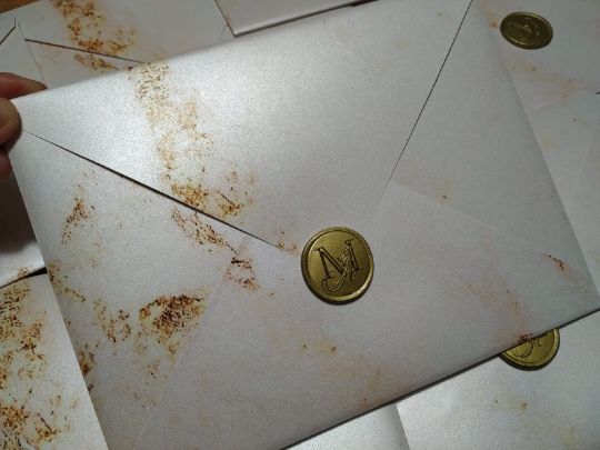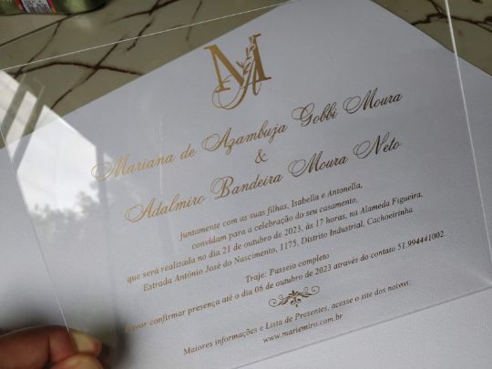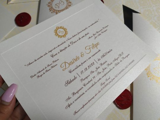 Convite tamanho 16x21cm, envelope produzido em papel Aspen Perolado 250g com impressão digital, convite em PTG transparente com impressão Silk Screen dourada e acabamento com lacre de cera personalizado. Pedido mínimo: 50 unidades. Prazo de produção: até 15 dias úteis a partir da aprovação da arte.