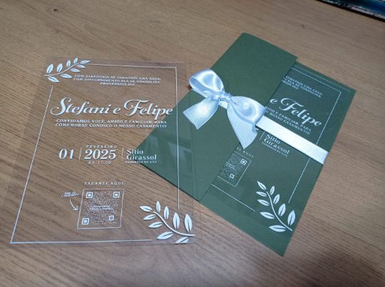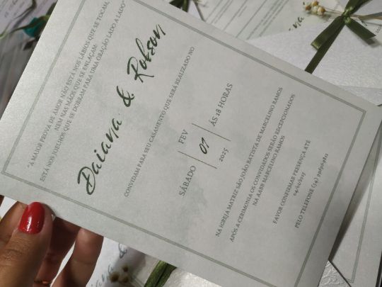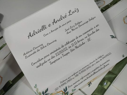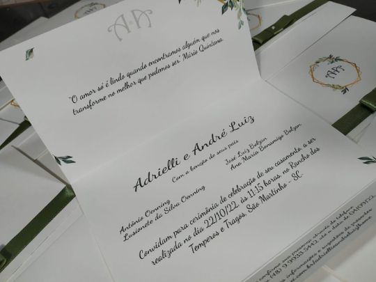 Convite tamanho 20x14cm, envelope em papel Verde Escuro Fosco 180g, convite em papel Linho 240g e acabamento com cordão + lacre nossos modelos (consultar modelos) + sempre viva. Pedido mínimo: 30 unidades. Prazo de produção: até 12 dias úteis a partir da aprovação da arte.