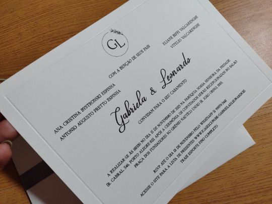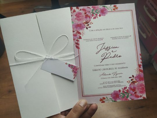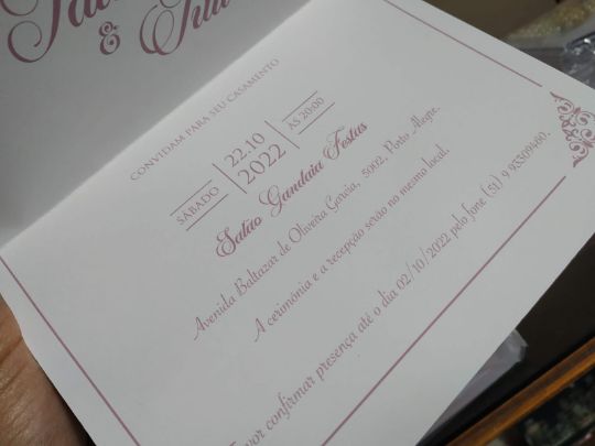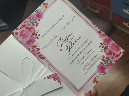 Convite 20x30cm (aberto) e 15x20cm (fechado), produzido em papel Offset Matte 240g com acabamento de cordão encerado. Pedido mínimo: 30 unidades. Prazo de produção: até 12 dias úteis a partir da aprovação da arte