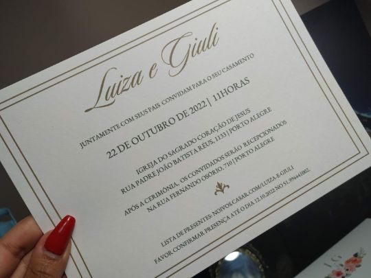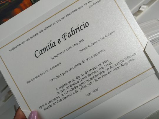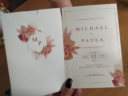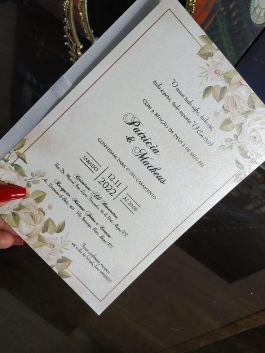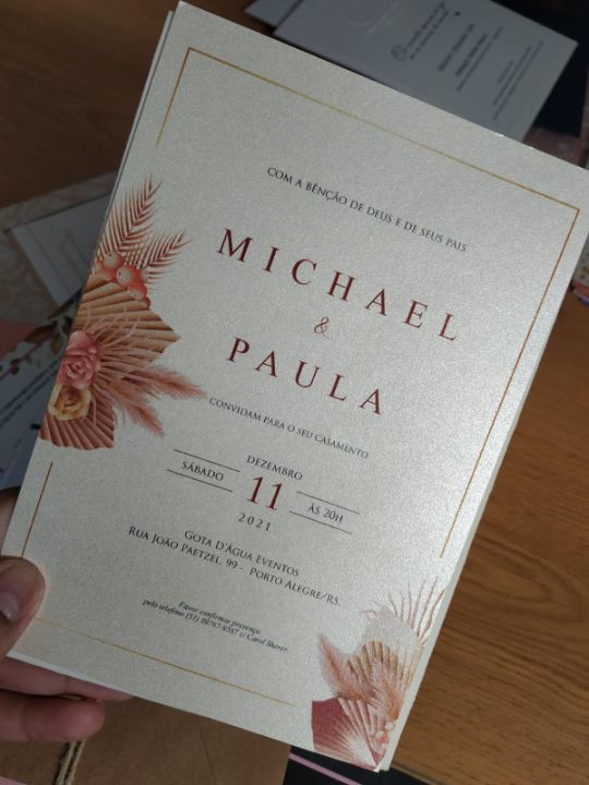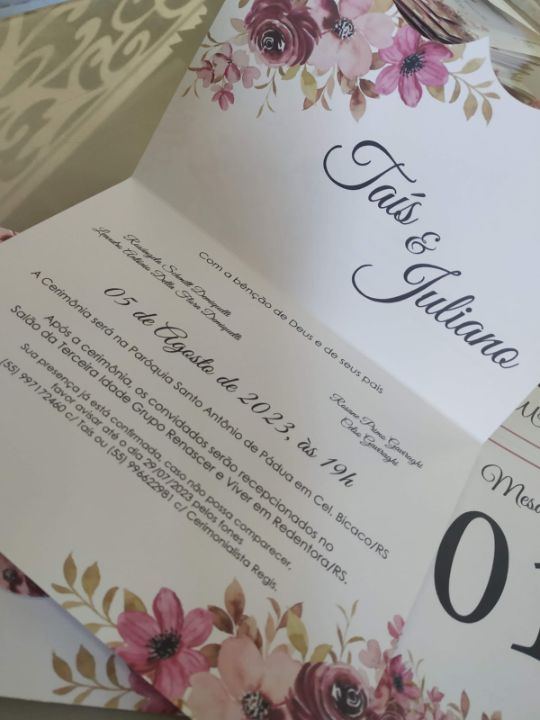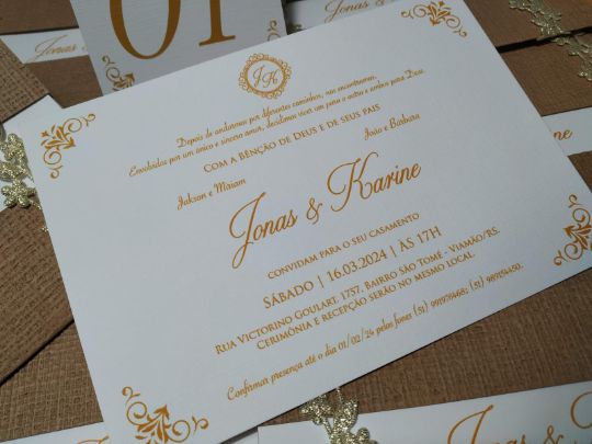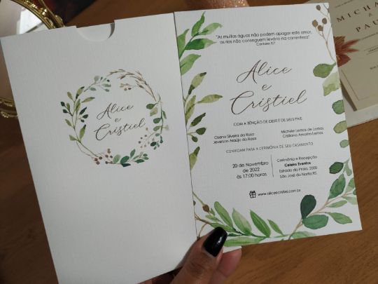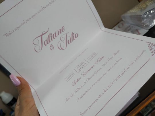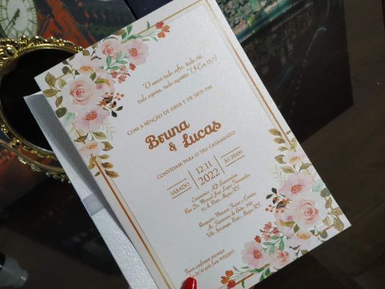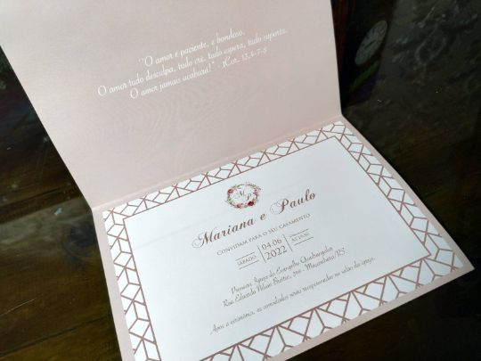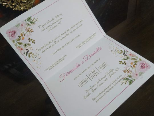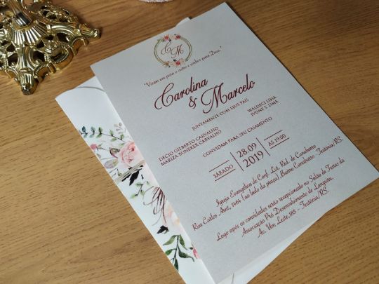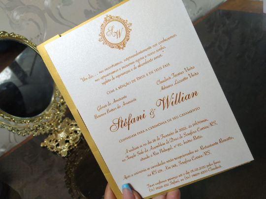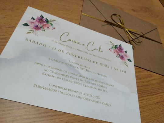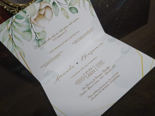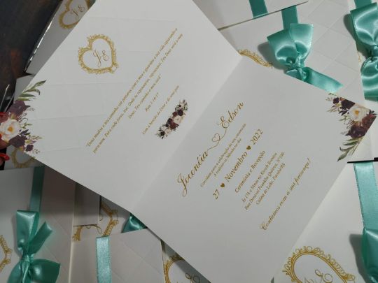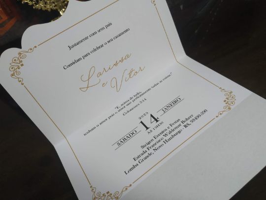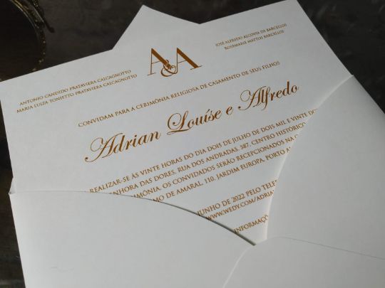 Convite 16,5x20cm (fechado) e 20x29cm (aberto), produzido em papel Offset Matte 240g com fechamento em meia pérola dourada. Pedido mínimo: 30 unidades. Prazo de produção: até 12 dias úteis a partir da aprovação da arte.