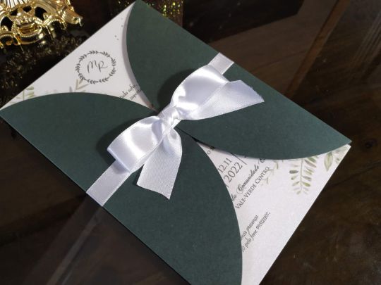 Convite 20x15cm, envelope em papel Color Plus Verde Escuro Santiago 180g, convite em papel Aspen Perolado 250g e acabamento com laço de cetim. Pedido mínimo: 30 unidades. Prazo de produção: até 12 dias úteis a partir da aprovação da arte.