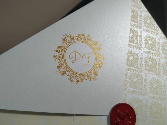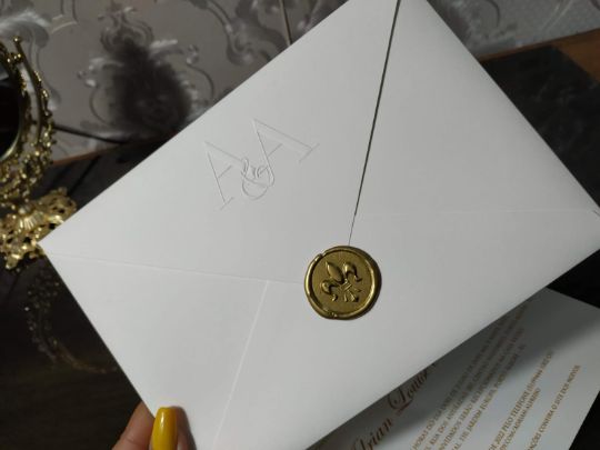 Convite tamanho 24x17cm produzido em papel Markatto Concetto Bianco 250g, envelope com relevo seco personalizado e acabamento com lacre de cera modelo flor de lis. Pedido mínimo: 50 unidades. Prazo de produção: até 12 dias úteis a partir da aprovação da arte.