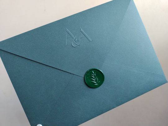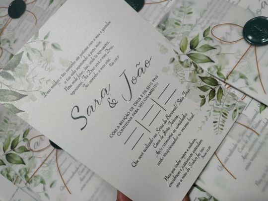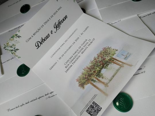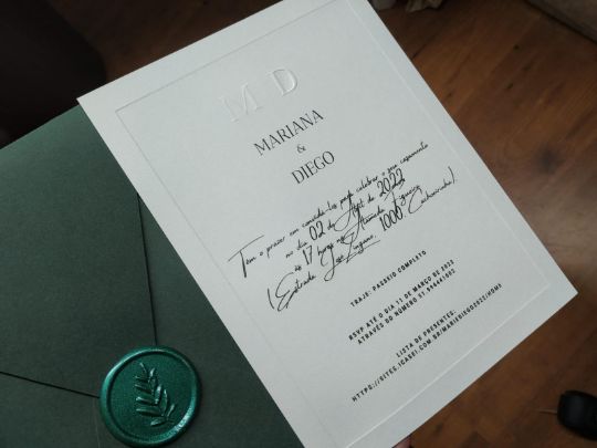 Convite 21x15cm, envelope em papel Color Plus Verde Escuro Santiago 180g, convite em papel Markatto Fineza Bianco 250g com relevo seco personalizado e borda em relevo e fechamento com lacre de cera modelo folhinha. Pedido mínimo: 50 unidades. Prazo de produção: até 12 dias úteis a partir da aprovação da arte.