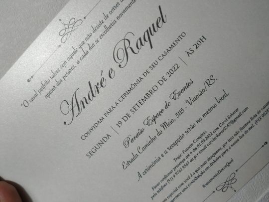 Convite 20x30cm (aberto) e 15x20cm (fechado), produzido em papel Couché 300g com aplicação de Prolan fosco e aplicação de verniz brilhante na estampa linear, acabamento de fita de cetim. Pedido mínimo: 50 unidades. Prazo de produção: até 12 dias úteis a partir da aprovação da arte.