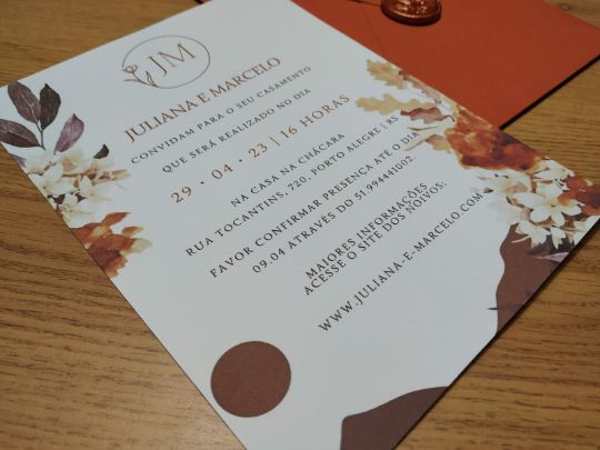 Convite 21x15cm, envelope em Terracota Fosco 180g, convite em papel Linho 240g e acabamento com lacre flor de lis. Pedido mínimo: 30 unidades. Prazo de produção: até 12 dias úteis a partir da aprovação da arte.
