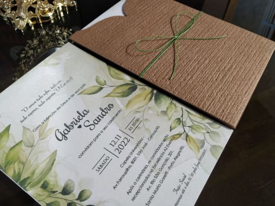 Convite 20x15cm, envelope em papel Vegetal 180g com impressão de folhas, convite em papel Aspen Perolado 250g e fechamento com cordão encerado + lacre modelo folhinha. Pedido mínimo: 30 unidades. Prazo de produção: até 12 dias úteis a partir da aprovação da arte.