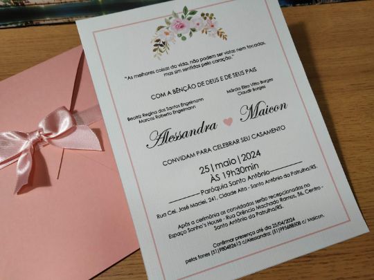 Convite 20x30cm (aberto) e 15x20cm (fechado), produzido em papel Offset Matte 240g com acabamento com fita de cetim Pedido mínimo: 30 unidades. Prazo de produção: até 12 dias úteis a partir da aprovação da arte.