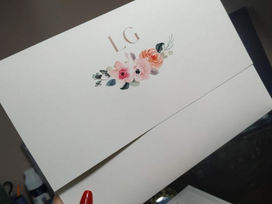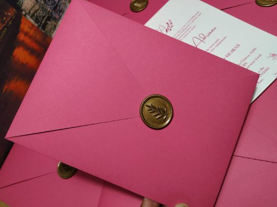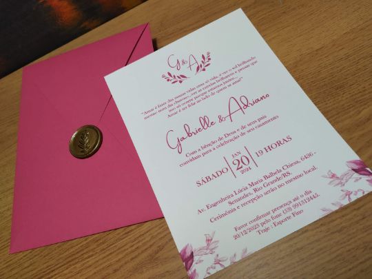 Convite 21x15cm, envelope em Color Plus Rosa 180g, convite em papel Linho 240g e acabamento com lacre de cera modelo folha. Pedido mínimo: 30 unidades. Prazo de produção: até 12 dias úteis a partir da aprovação da arte.