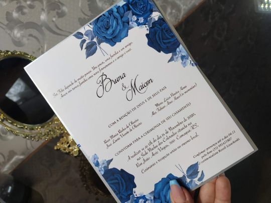 Convite 21x15cm, envelope em Color Plus Azul Marinho Fosco 180g, convite em papel Linho 240g e acabamento com fita de cetim. Pedido mínimo: 30 unidades. Prazo de produção: até 12 dias úteis a partir da aprovação da arte.