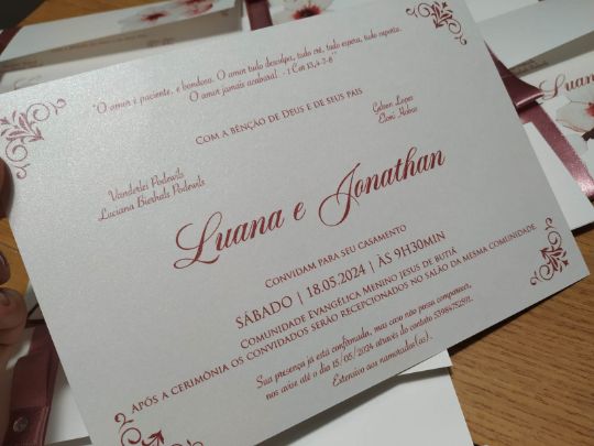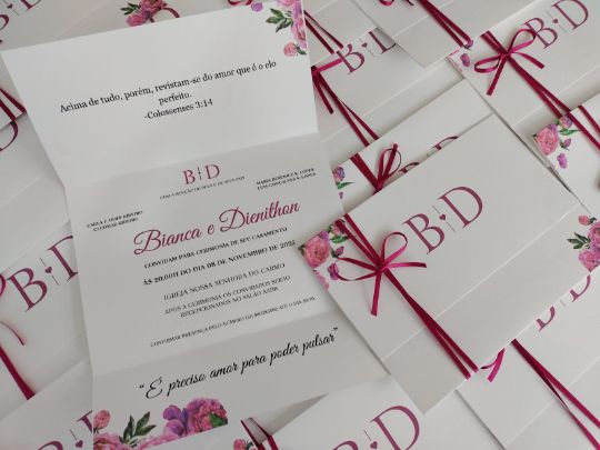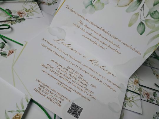 Convite 20x30cm (aberto) e 15x20cm (fechado), produzido em papel Offset Matte 240g com acabamento de cordão de cetim. Pedido mínimo: 30 unidades. Prazo de produção: até 12 dias úteis a partir da aprovação da arte