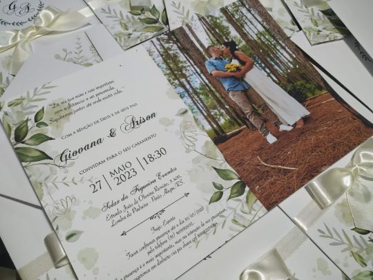 Convite 20x30cm (aberto) e 15x20cm (fechado), produzido em papel Offset Matte 240g com impressão de FOTO e acabamento de fita de cetim. Pedido mínimo: 30 unidades. Prazo de produção: até 12 dias úteis a partir da aprovação da arte.