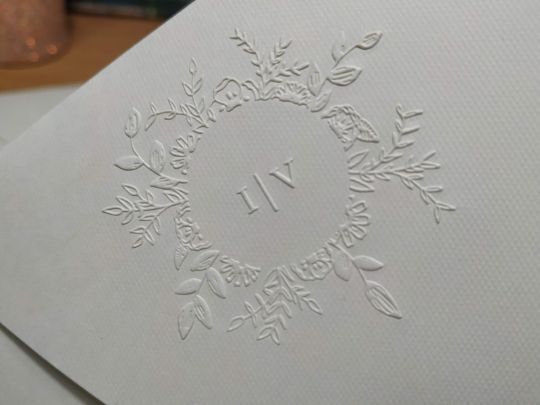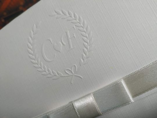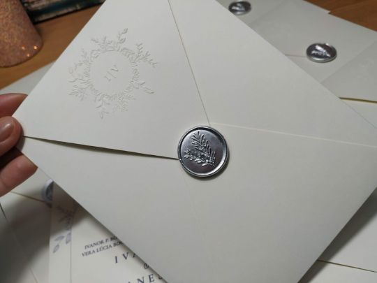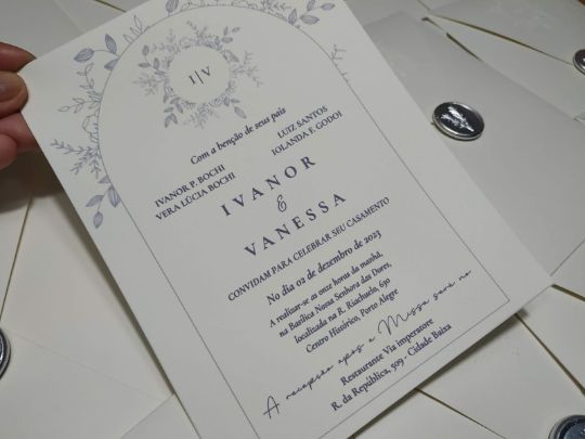 Convite tamanho 15x20cm, convites em papel Markatto Concetto Bianco 250g com relevo seco personalizado no envelope e acabamento com lacre de cera modelo ramo.Pedido mínimo: 50 unidades. Prazo de produção: até 12 dias úteis a partir da aprovação da arte.