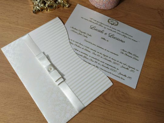 Convite tamanho 24x17cm, envelope em papel texturizado com brilho perolado 240g (PAPEL INDISPONÍVEL - consultar outras opções), convite em papel Aspen Perolado 250g e acabamento com fita de cetim. Pedido mínimo: 50 unidades. Prazo de produção: até 12 dias úteis a partir da aprovação da arte.