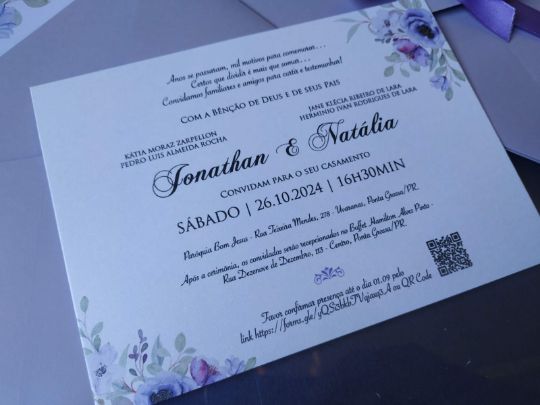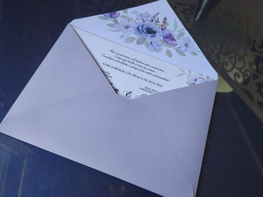 Convite tamanho 16x21cm, envelope em papel Color Plus Lilás Fosco 180g com aplicação de forro floral, convite em papel Aspen Perolado 250g e acabamento com fitinha de cetim. Pedido mínimo: 50 unidades. Prazo de produção: até 12 dias úteis a partir da aprovação da arte.