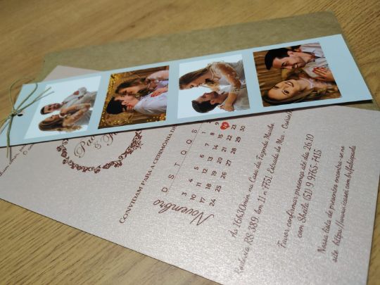Convite 24x12cm, envelope em papel Kraft Rústico 180g, convite em papel Rose Gold Perolado 300g, tira anexada com fotos e acabamento com cordão encerado. Pedido mínimo: 50 unidades. Prazo de produção: até 12 dias úteis a partir da aprovação da arte.