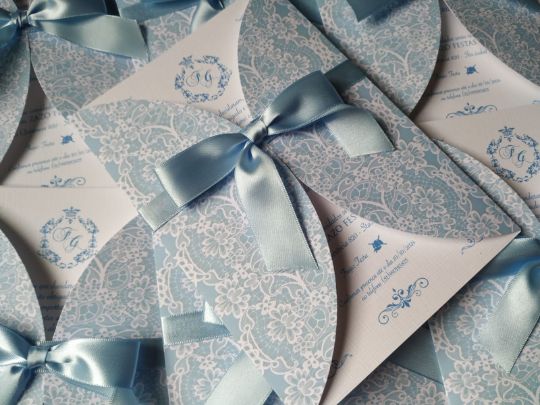 Convite 20x15cm, envelope vazado com corte a laser em papel Azul Fosco 180g, convite em papel Linho 240g e acabamento com cordão encerado. Pedido mínimo: 30 unidades. Prazo de produção: até 12 dias úteis a partir da aprovação da arte.