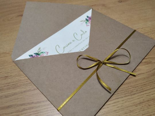 Convite tamanho 16x21cm, envelope produzido em papel Kraft Rústico 180g, convite impresso em papel Linho 140g e acabamento com lacinho de cetim. Pedido mínimo: 50 unidades. Prazo de produção: até 15 dias úteis a partir da aprovação da arte.