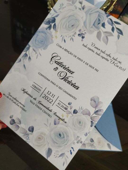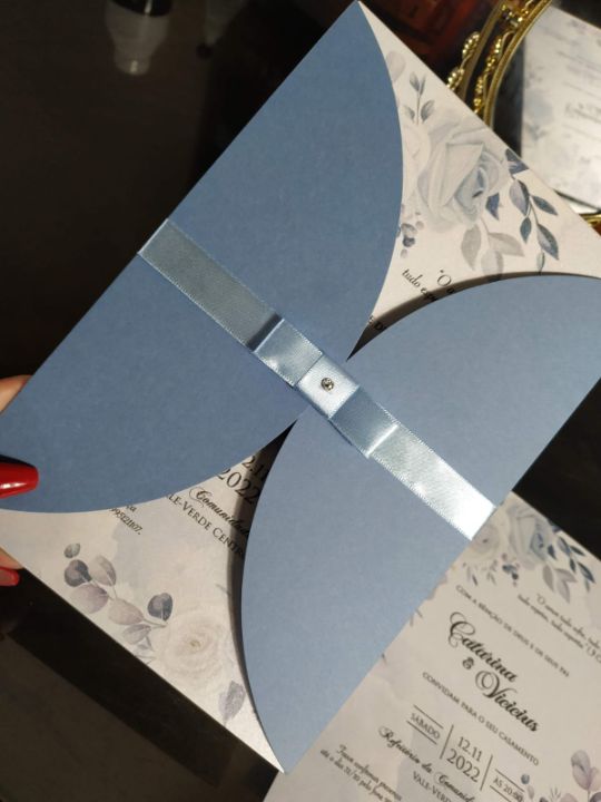 Convite 20x15cm, envelope em Color Plus Azul Serenity Fosco 180g, convite em papel Aspen perolado 250g e acabamento com fita de cetim. Pedido mínimo: 30 unidades. Prazo de produção: até 12 dias úteis a partir da aprovação da arte.
