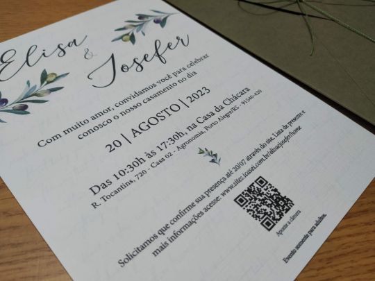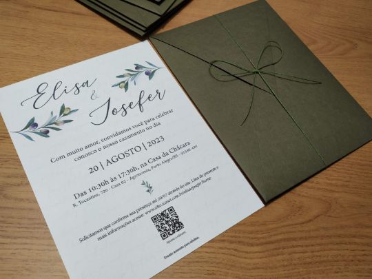 Convite 21x15cm, envelope em papel Color Plus Verde Oliva 180g, convite em papel Linho 240g e fechamento com cordão encerado. Pedido mínimo: 30 unidades. Prazo de produção: até 12 dias úteis a partir da aprovação da arte.
