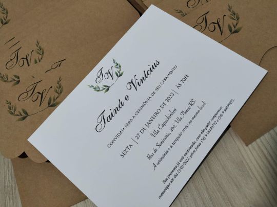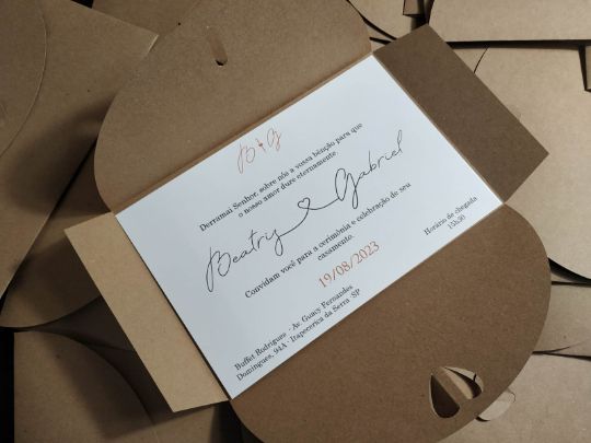 Convite tamanho 15x21cm, envelope em papel Kraft Rústico 180g, convite em papel Offset Branco Fosco 240g. Pedido mínimo: 30 unidades. Prazo de produção: até 12 dias úteis a partir da aprovação da arte.