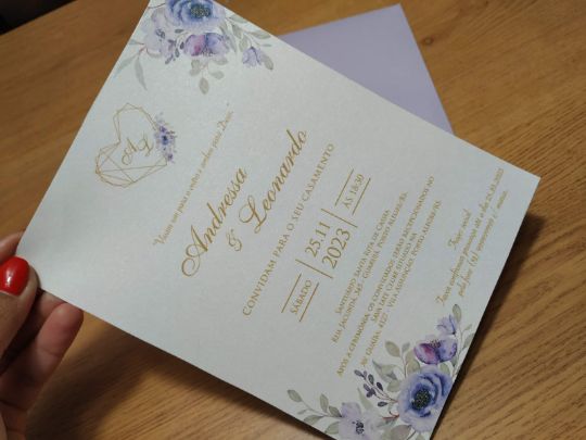 Convite 21x15cm, envelope em Lilas Fosco 180g, convite em papel Aspen Perolado 250g e acabamento com lacre modelo folhinha. Pedido mínimo: 30 unidades. Prazo de produção: até 12 dias úteis a partir da aprovação da arte.