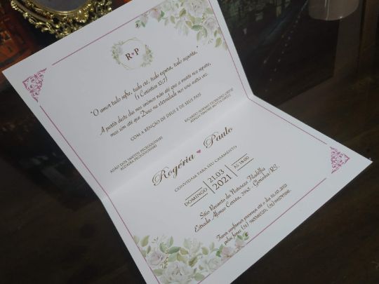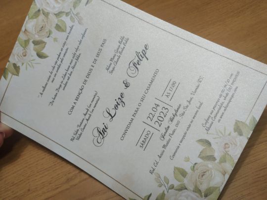 Convite 24x17cm, em papel Markatto Concetto Bianco 250g. Pedido mínimo: 50 unidades. Prazo de produção: até 12 dias úteis a partir da aprovação da arte.