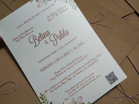 Convite 20x14cm, envelope em papel Kraft Rústico 180g, convite em papel Linho 180g e fechamento com meia pérola. Pedido mínimo: 30 unidades. Prazo de produção: até 12 dias úteis a partir da aprovação da arte.