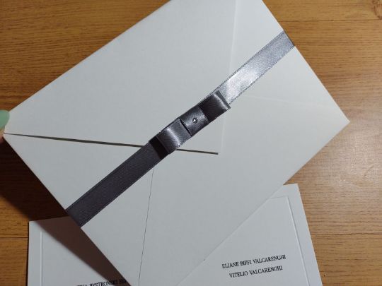 Convite 21x15cm, envelope em papel Linho 180g, convite em papel Linho 240g e acabamento com fita de cetim. Pedido mínimo: 30 unidades. Prazo de produção: até 12 dias úteis a partir da aprovação da arte.