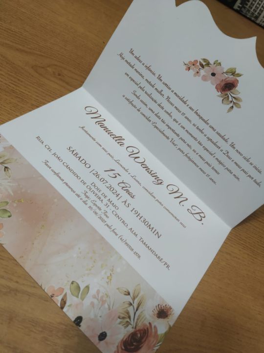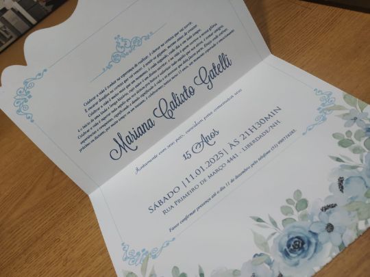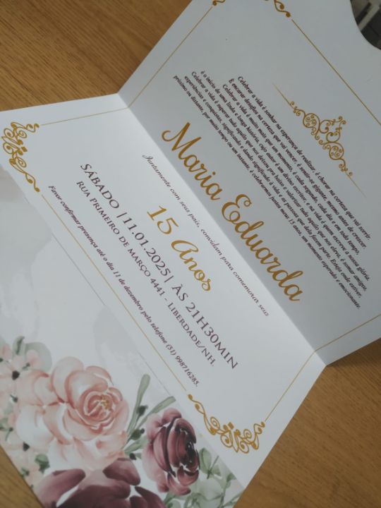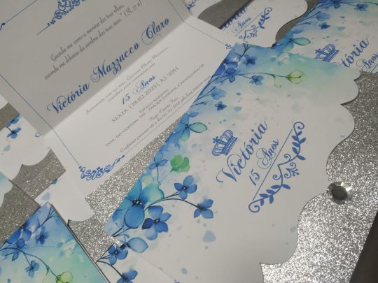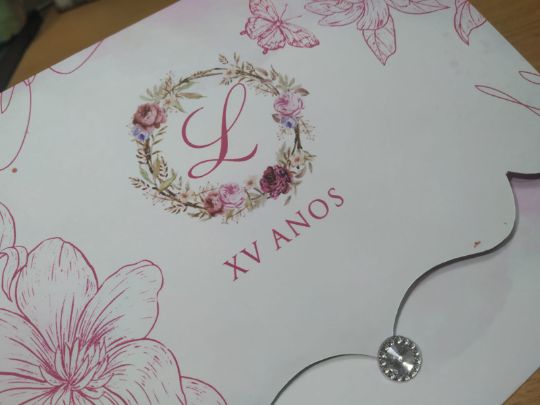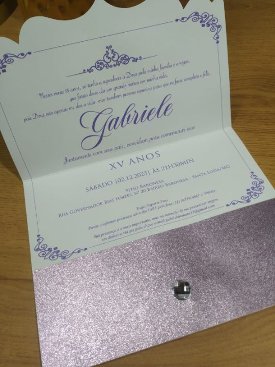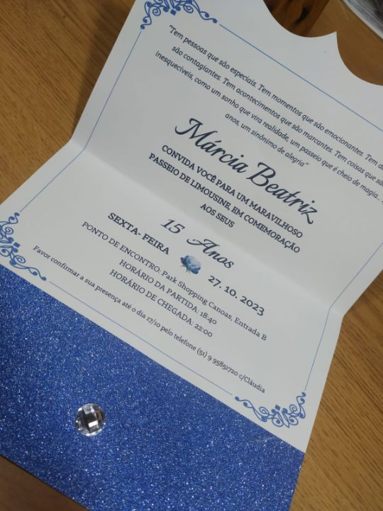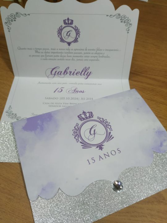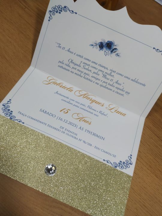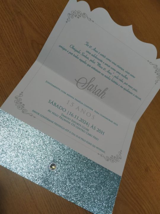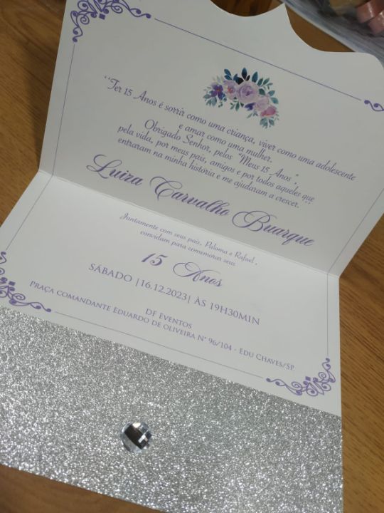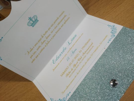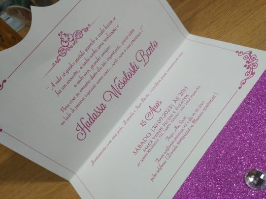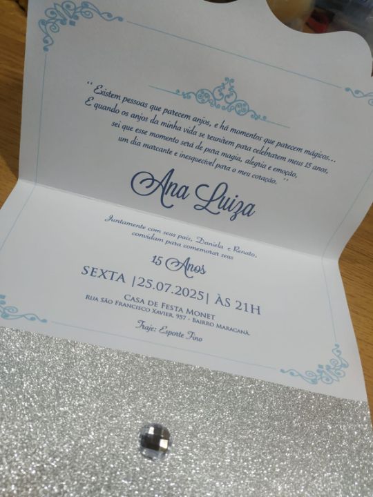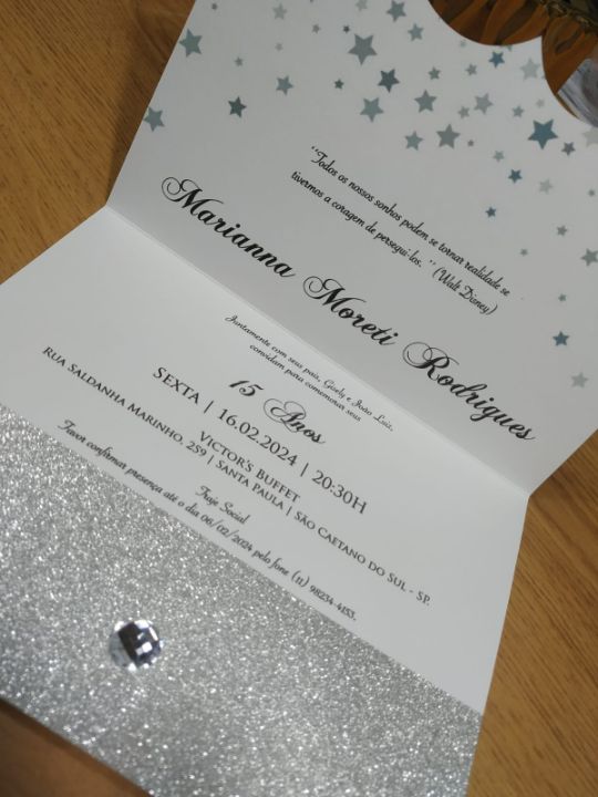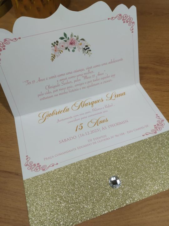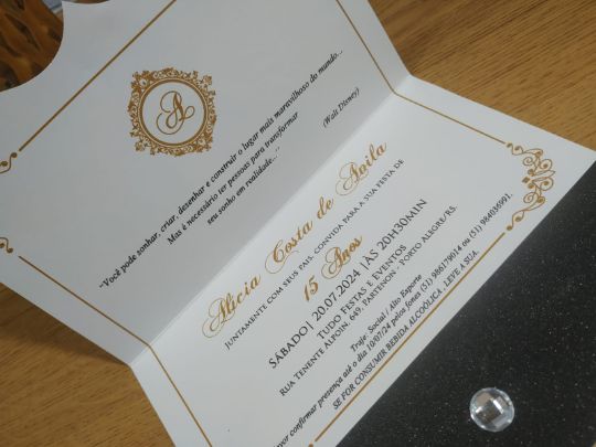 Dimensões fechado: 16,5x20cm e aberto: 20x29, produzido em papel Offset 240g (branco fosco de alta gramatura) com aplicação de glitter e fechamento com strass. Pedido mínimo: 30 unidades. Prazo de produção: até 12 dias úteis a partir da aprovação da arte.